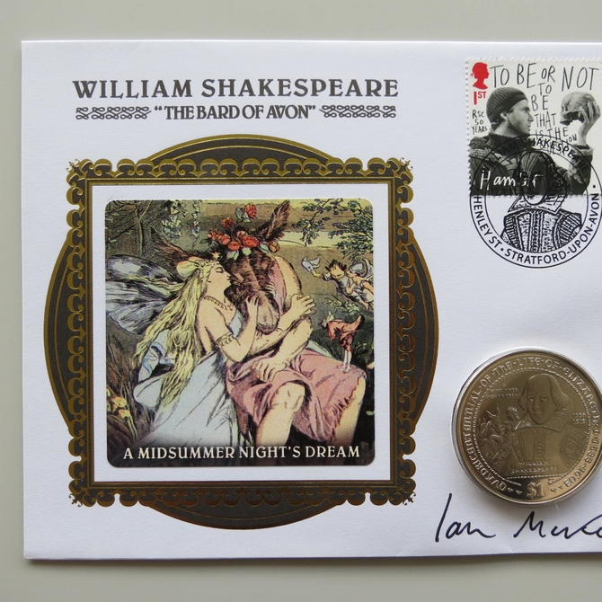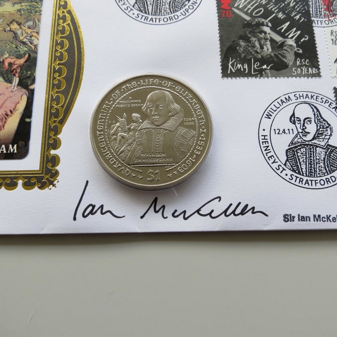 This 2011 William Shakespeare The Bard of Avon 1 Dollar coin cover is issued by Benham UK PNC First Day Covers. FDC hand signed by Sir Ian McKellen. It hosts a brilliant uncirculated one dollar coin by British Virgin Islands and Royal Mail stamps. Postmark cancelled dated 12th April 2011.