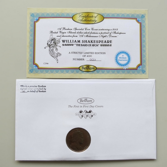 2011 William Shakespeare The Bard of Avon 1 Dollar Coin Cover - Benham Signed UK PNC