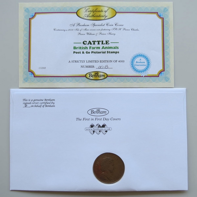 This 2012 Cattle British farm animals 1 Crown coin cover is issued by Benham as UK PNC First Day Covers. FDC hamd signed by Christopher Timothy. It hosts a brilliant uncirculated one crown coin by the Isle of Man and Royal Mail stamps. Postmark cancelled dated 28th September 2012.