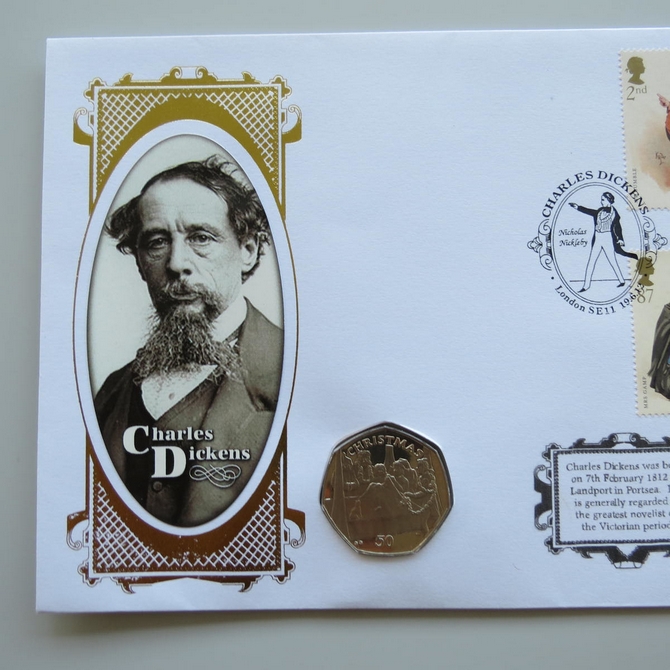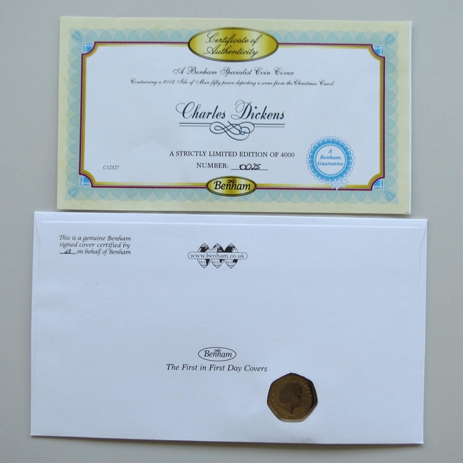 This 2012 Charles Dickens Isle of Man 50p pence coin cover is issued by Benham as UK PNC First Day Covers. FDC hand signed by Mark Heap. It hosts a brilliant uncirculated Isle of Man Christmas 50p pence coin and Royal Mail stamps. Postmark cancelled dated 19th June 2012.