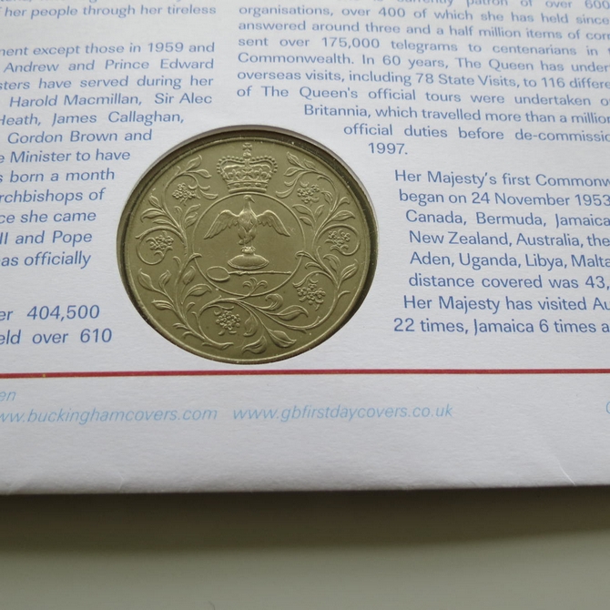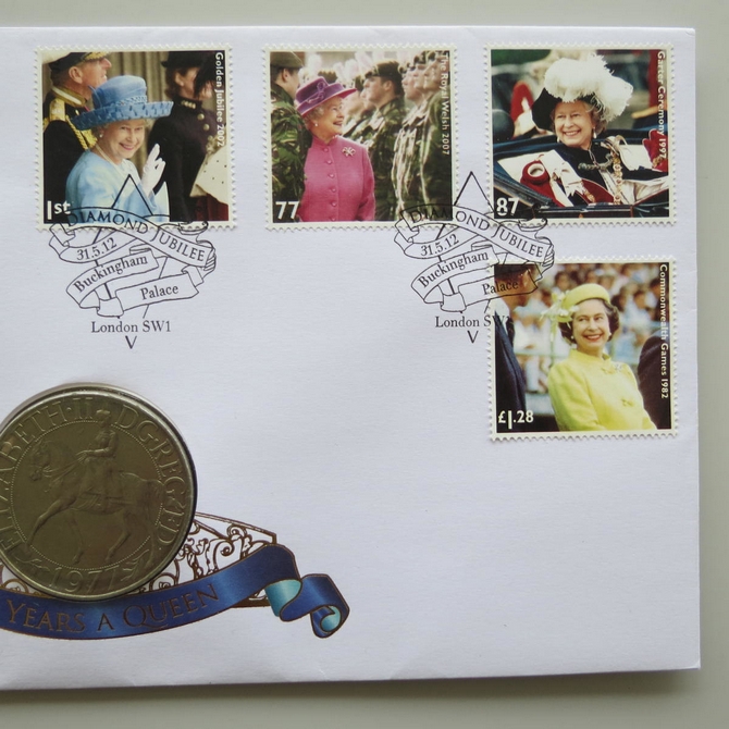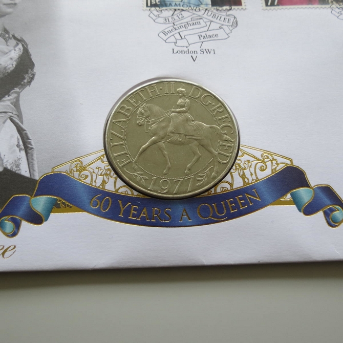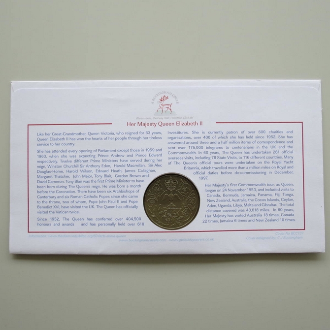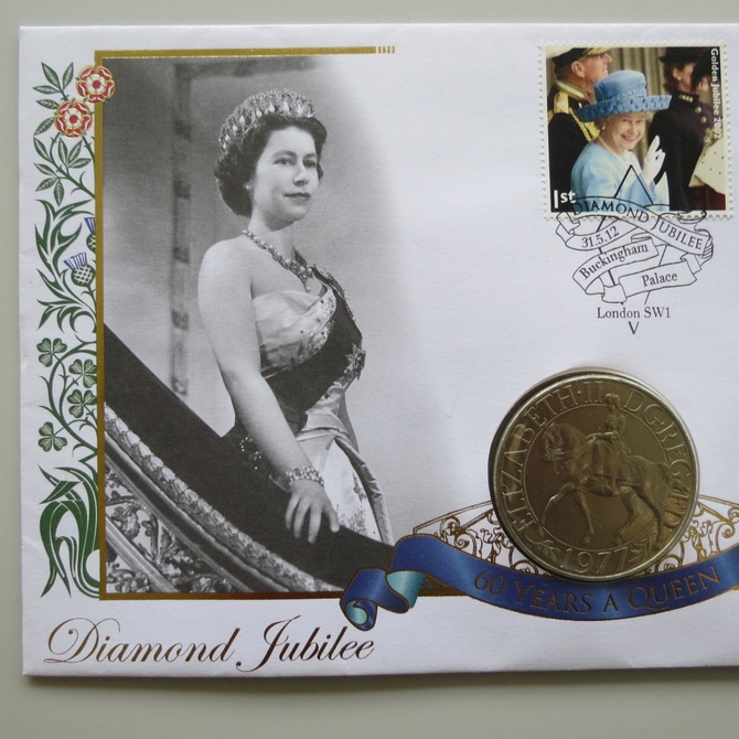 This 2012 Diamond Jubilee 60 Years a Queen crown coin cover is issued by Buckingham Covers as UK First Day Covers. It commemorates the Diamond Jubilee of Queen Elizabeth II and hosts a crown coin and Royal Mail stamps. Cancelled postmark Diamond Jubilee Buckingham Palace London SW1.