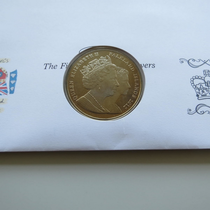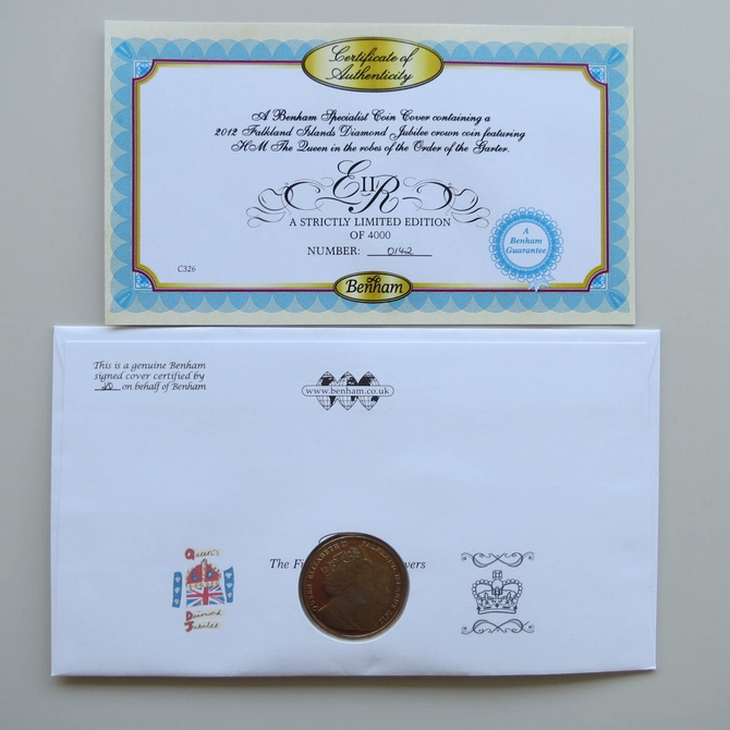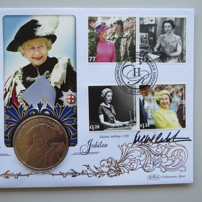 This 2012 HM Queen Elizabeth II Diamond Jubilee Crown coin cover is issued by Benham as UK PNC First Day Covers. FDC hand signed by Dickie Arbiter. It hosts a brilliant uncirculated one crown coin by the Falkland Islands and Royal Mail stamps. Postmark cancelled dated 31st May 2012.