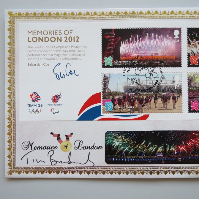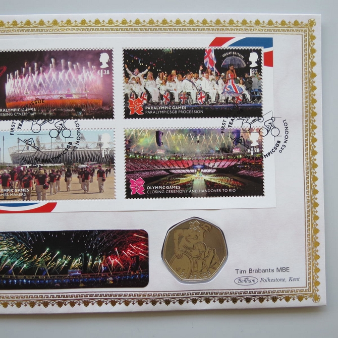 This 2012 Memories of London 2012 Olympics 50p pence coin cover is issued by Benham as UK PNC First Day Covers. FDC hand signed by Tim Brabants. It hosts a brillinat uncirculated Wheelchair Rugby fifty pence coin by the Royal Mint and Royal Mail stamps. Postmark cancelled dated 27th September 2012.
