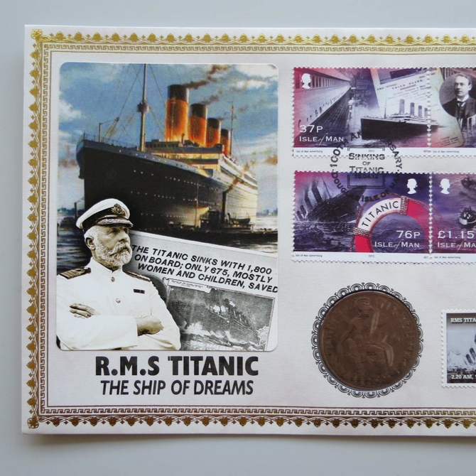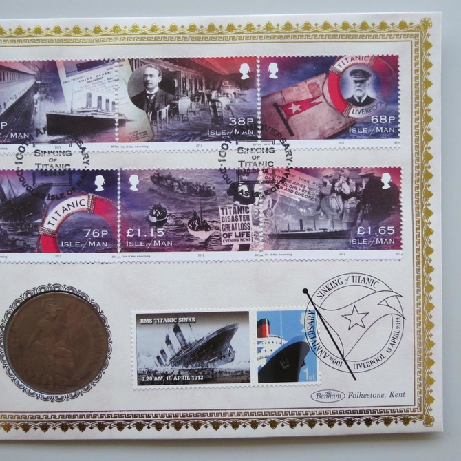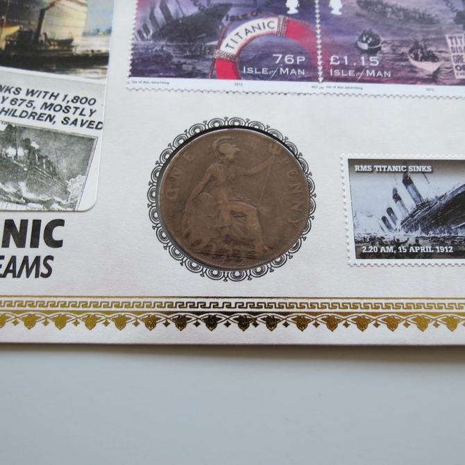 This 2012 RMS Titanic The Ship of Dreams penny coin cover is issued by Benham as UK PNC First Day Covers. It hosts a 1912 King George V bronze penny and Royal Mail stamps. Postmark cancelled dated 15th April 2012.
