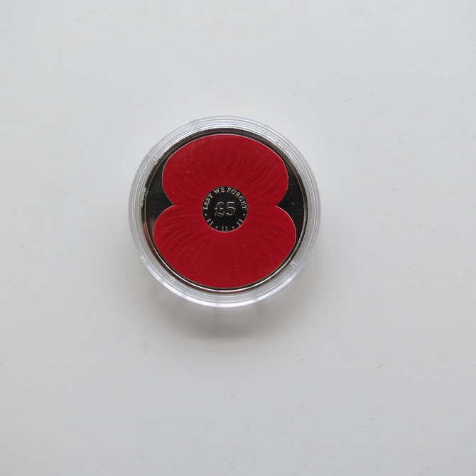 This 2012 Remembrance Day 5 pounds coin is issued by Jersey. It commemorates Armistice Day and the brilliant uncirculated five pound coin shows a red poppy with the inscription Lest We Forget. Comes presented in a coin capsule.