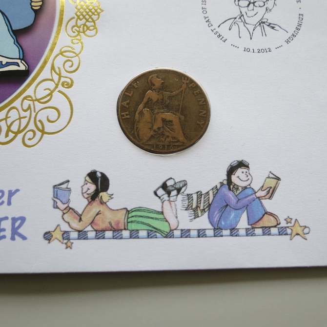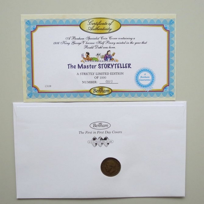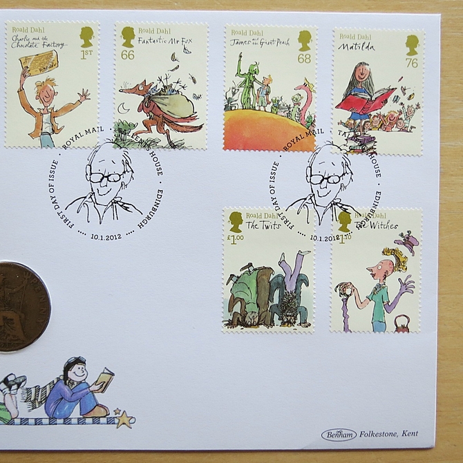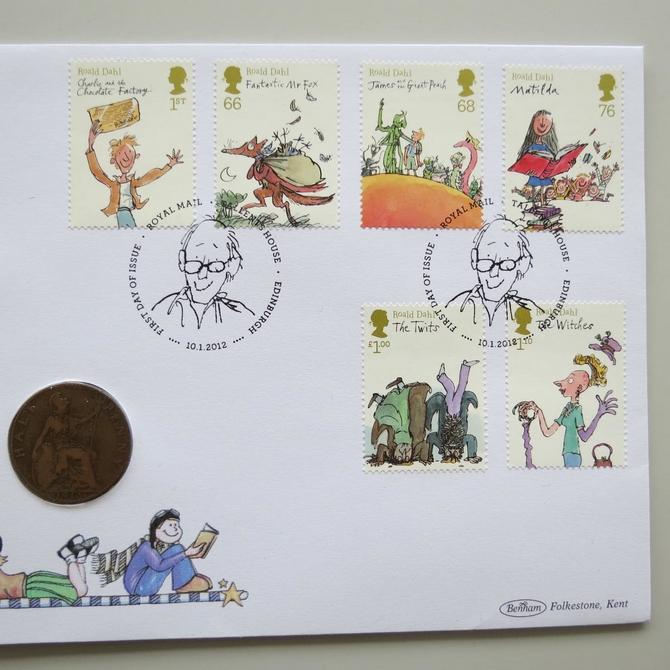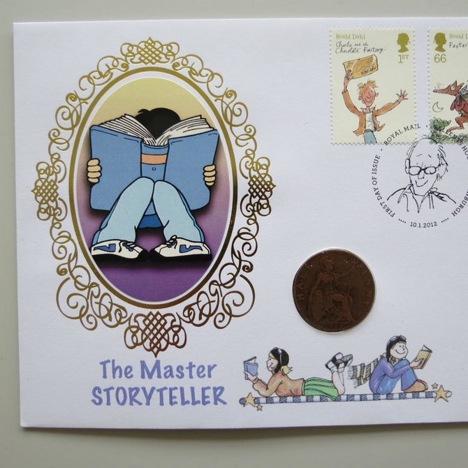 This 2012 Roald Dahl The Master Story Teller half penny coin cover is a first day cover by Benham covers. It celebrates Roald Dahl and his stories and hosts a 1916 King George V half penny and Royal Mail commemorative stamps published to celebrate the many works of Roald Dahl. Cancelled postmark First Day of Issue Royal Mail Tallents House Edinburgh 10th January 2012.