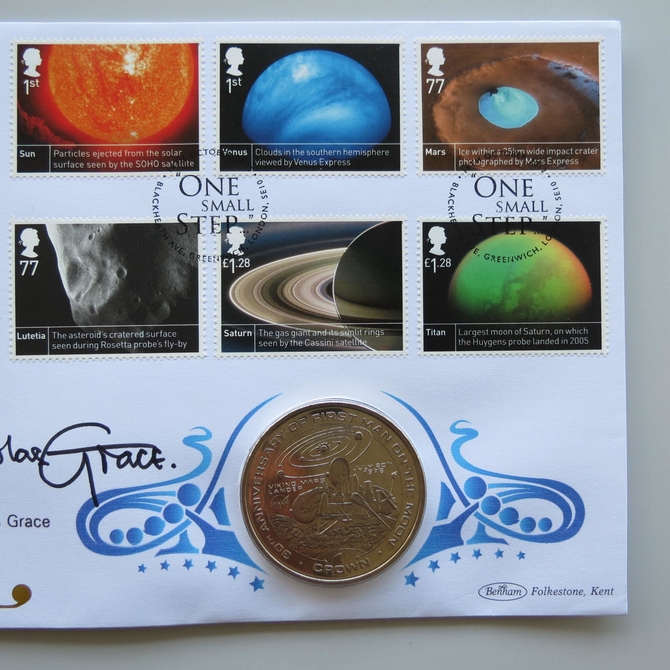 This 2012 Space Science 1 Crown Coin is issued by Benham as UK PNC First Day Covers. FDC hand signed by Nickolas Grace. It hosts a brilliant uncirculated one crown coin by the Isle of Man and Royal Mail stamps. Postmark cancelled dated 16th October 2012.