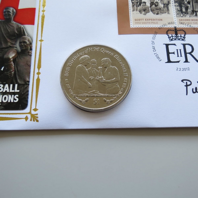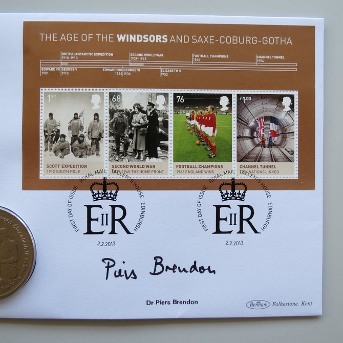 This 2012 The Age of the Windsors 1 dollar coin cover is a Benham first day cover. It commemorates the Windsors & Saxe-Coburg-Gotha and hosts a brilliant uncirculated Sierra Leone one dollar coin and Royal Mail stamps. FDC hand signed by Piers Brendon. Cancelled postmark EiiR First Day of Issue Royal Mail Tallents House Edinburgh 2nd February 2012