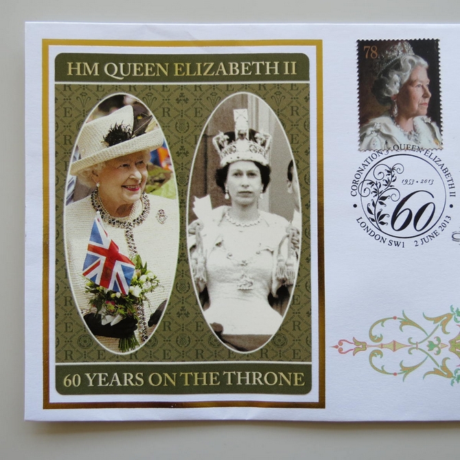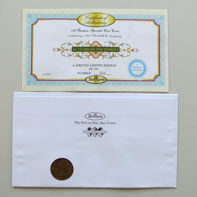 This 2013 60 Years on the Throne 1 Penny coin cover is issued by Benham as UK PNC First Day Covers. It hosts a 1953 Elizabeth II one penny coin and Royal Mail stamps. Postmark cancelled dated 6th February 2013.
