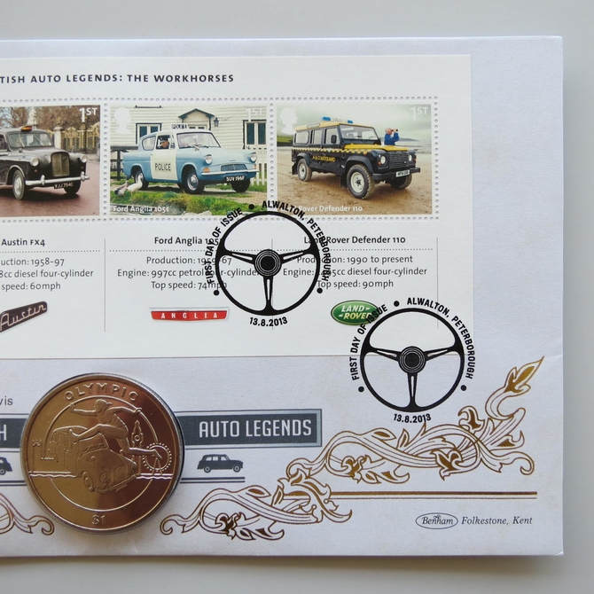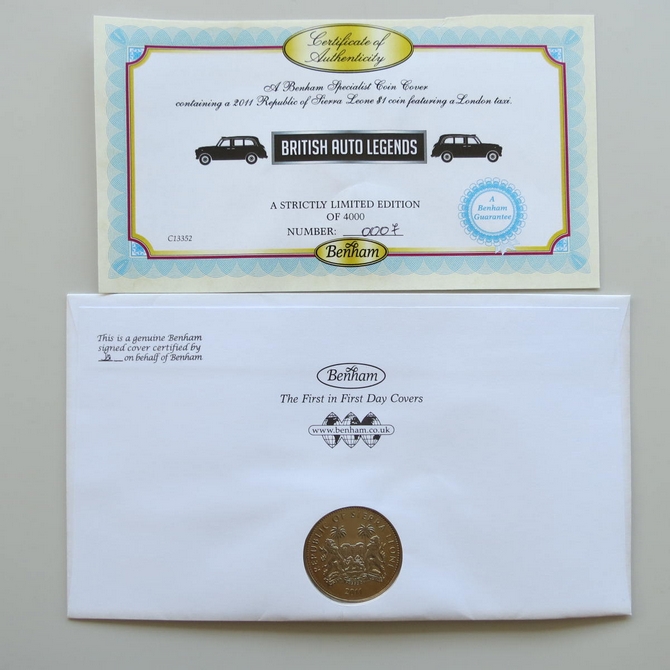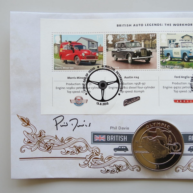 This 2013 British Auto Legends 1 Dollar coin cover is issued by Benham as UK PNC First Day Covers. FDC hand signed by Phil Davis. It hosts a brilliant uncirculated one dollar coin by Sierra Leone and Royal Mail stamps. Postmark cancelled dated 13th August 2013.