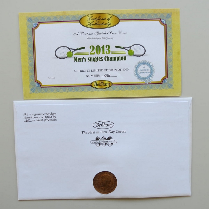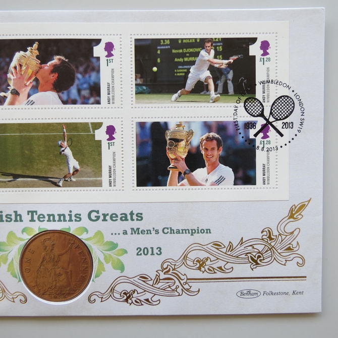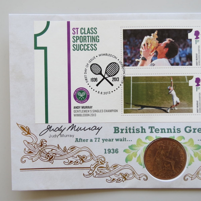This 2013 British Tennis Greats 1 Penny coin cover is issued by Benham as UK PNC First Day Covers. FDC hand signed by Judy Murray. It hosts a 1936 one penny coin and Royal Mail stamps. Postmark cancelled dated 8th August 2013.