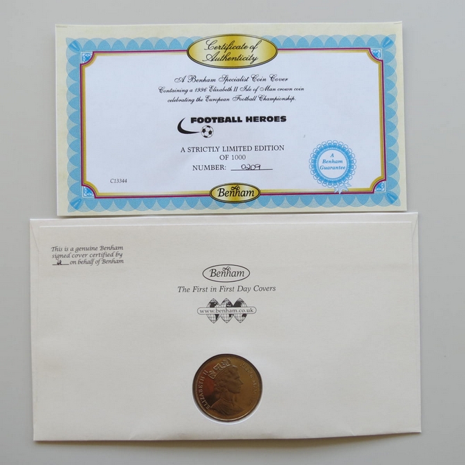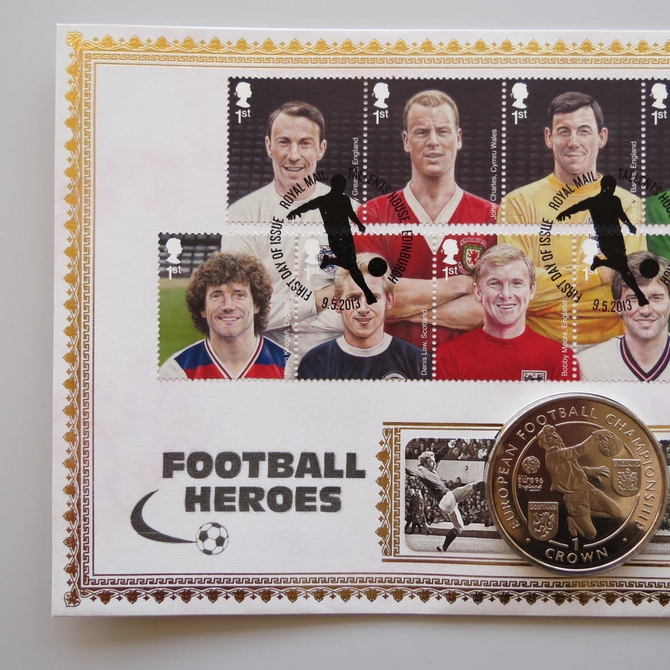 This 2013 Football Heroes 1 Crown coin cover is issued by Benham as UK PNC First Day Covers. FDC hand signed by Kevin Keegan. It hosts a brilliant uncirculated one crown coin by the isle of Man and Royal Mail stamps. Postmark cancelled dated 9th May 2013.