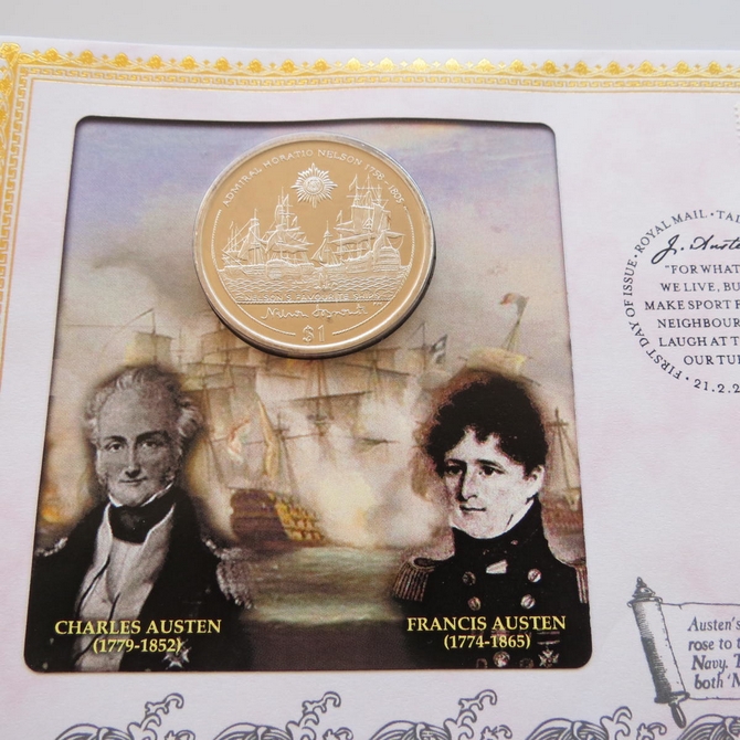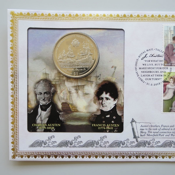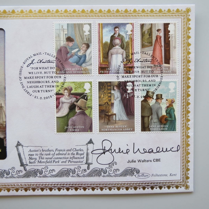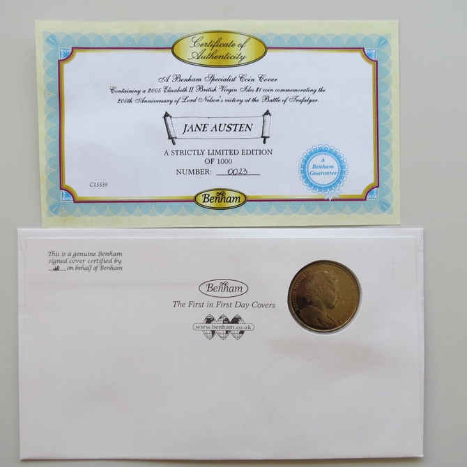 This 2013 Jane Austin 1 Dollar coin cover is issued by Benham as UK PNC First Day Covers. FDC hand signed by Julie Walters. It hosts a brilliant uncirculated one Dollar coin by the British Virgin Islands and Royal Mail stamps. Postmark cancelled dated 21st February 2013.