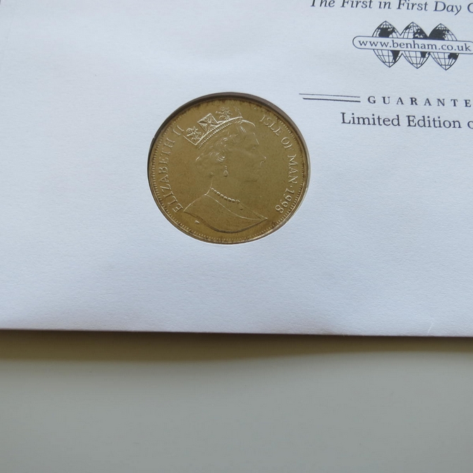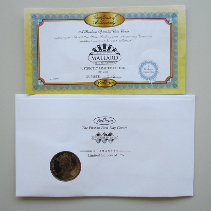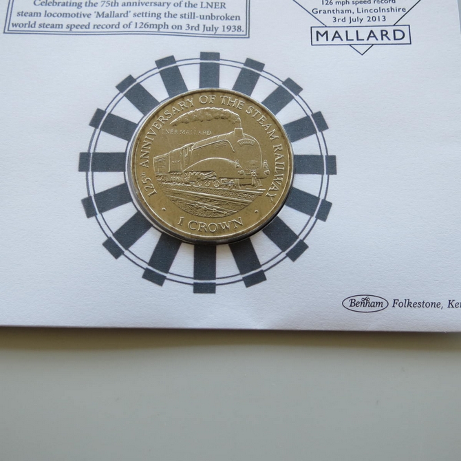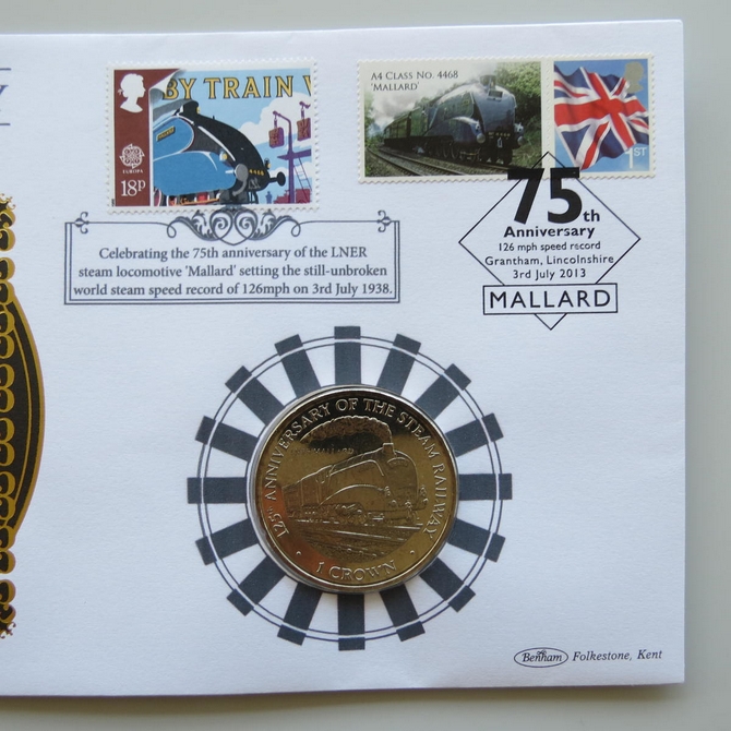 This 2013 Mallard 75th anniversary 1 Crown coin cover is issued by Benham as UK PNC First Day Covers. It hosts a brilliant uncirculated one crown coin by the Islae of Man and Royal Mail stamps. Postmark cancelled dated 3rd July 2013.