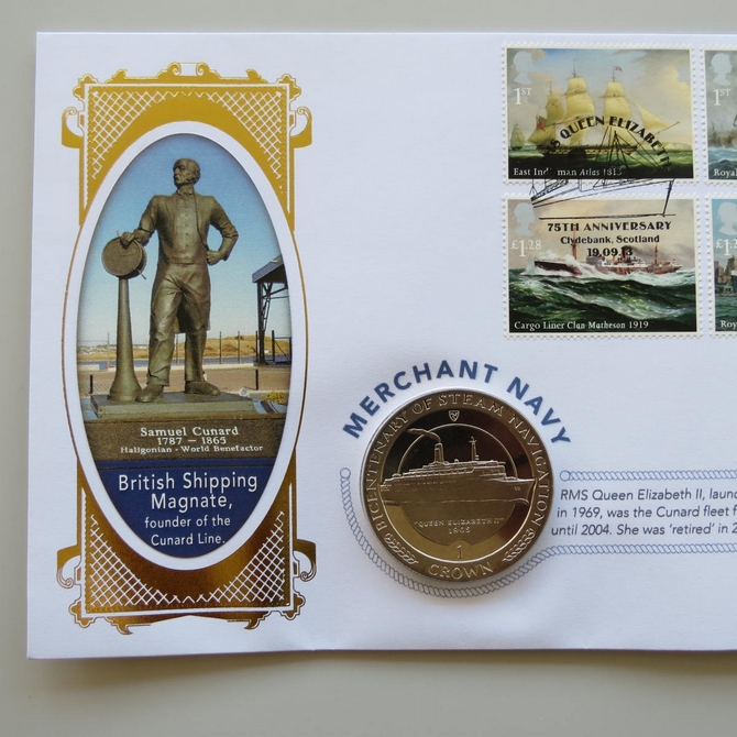 This 2013 Merchant Navy 1 Crown coin cover is issued by Benham as UK PNC First Day Covers. FDC hand signed by Chris Frame. It hosts a brilliant uncirculated one crown coin by the Isle of Man and Royal Mail stamps. Postmark cancelled dated 19th September 2013.