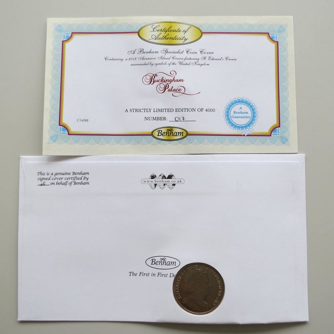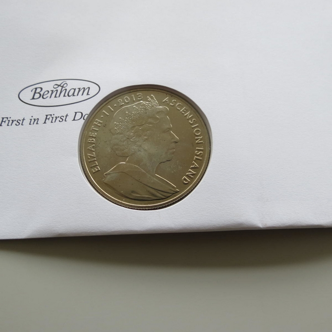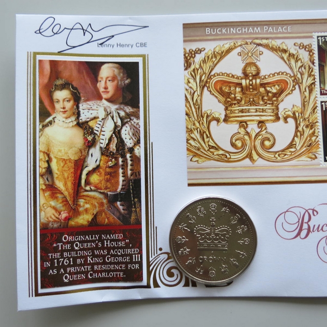 This 2014 Buckingham Palace 1 Crown coin cover is issued by Benham as UK PNC First Day Covers. FDC hand signed by Lenny Henry. It hosts a brilliant uncirculated one crown coin by the Ascension Island and Royal Mail stamps. Postmark cancelled dated 15th April 2014.
