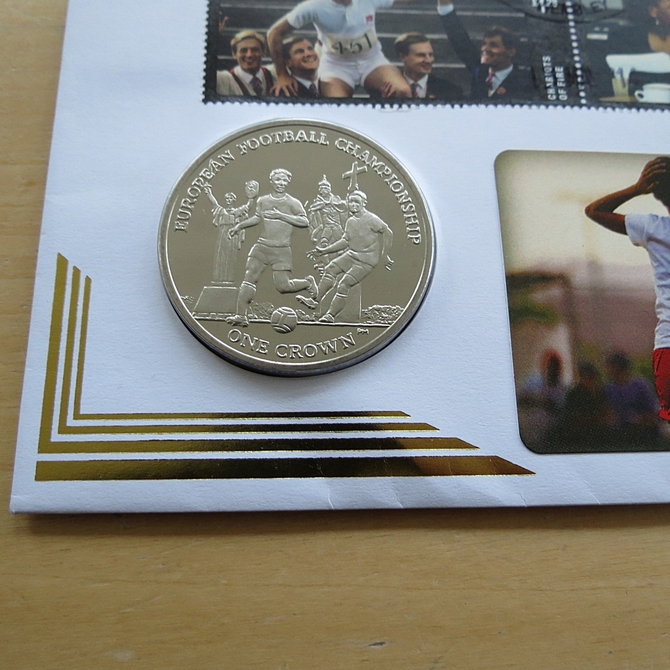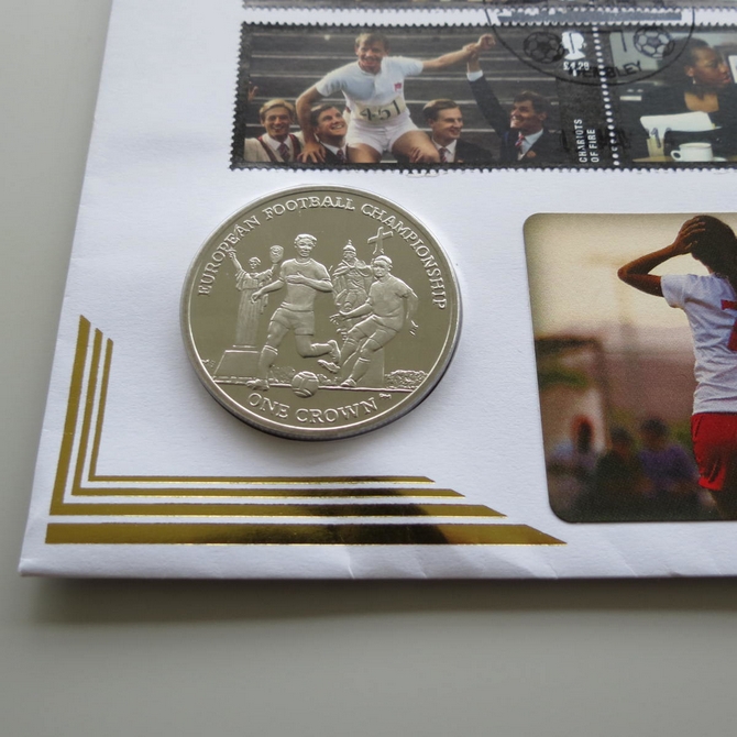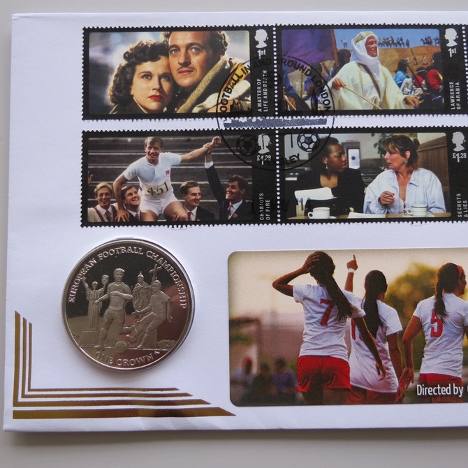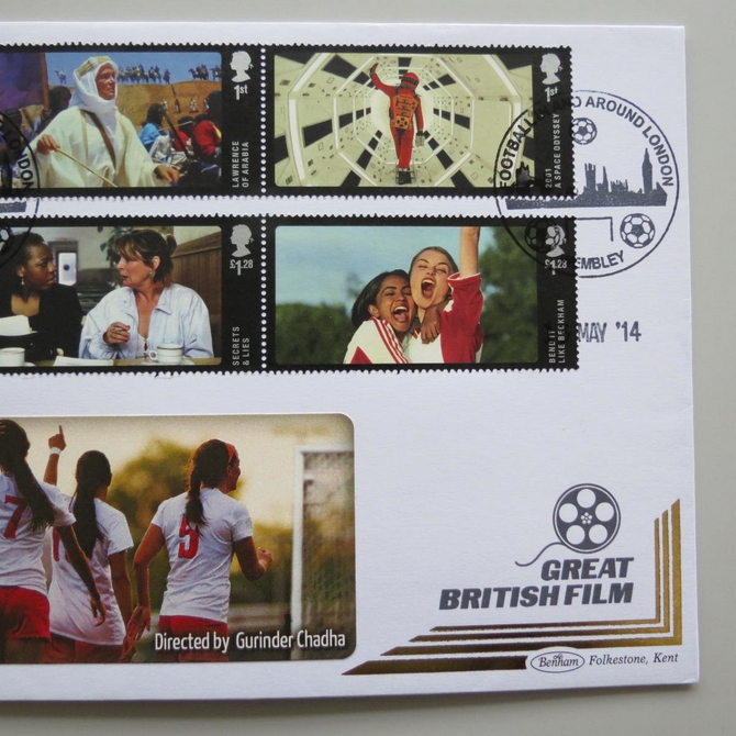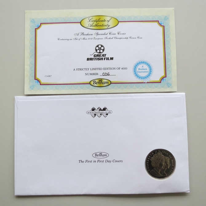 This 2014 Great British Film Isle of Man 1 crown coin cover is a Benham first day cover. It celebrates the many classic British films and hosts a brilliant uncirculated Isle of Man one crown coin and special Royal Mail commemorative stamps showing live scenes from memorable films. Cancelled postmark Football in and around London Wembley 13th May 2014.