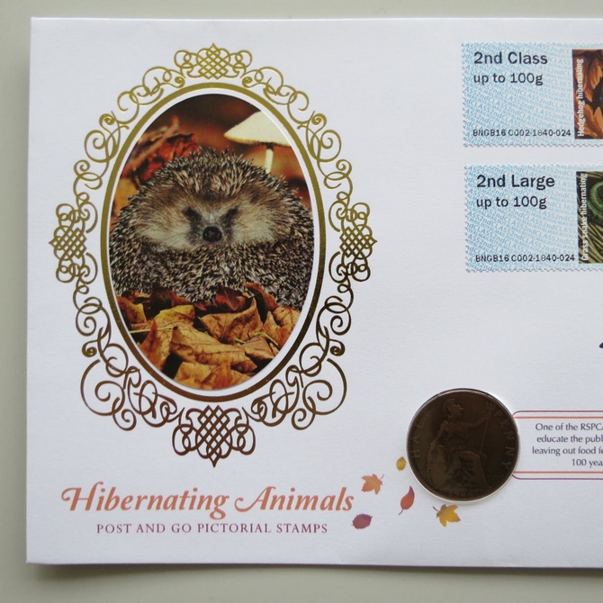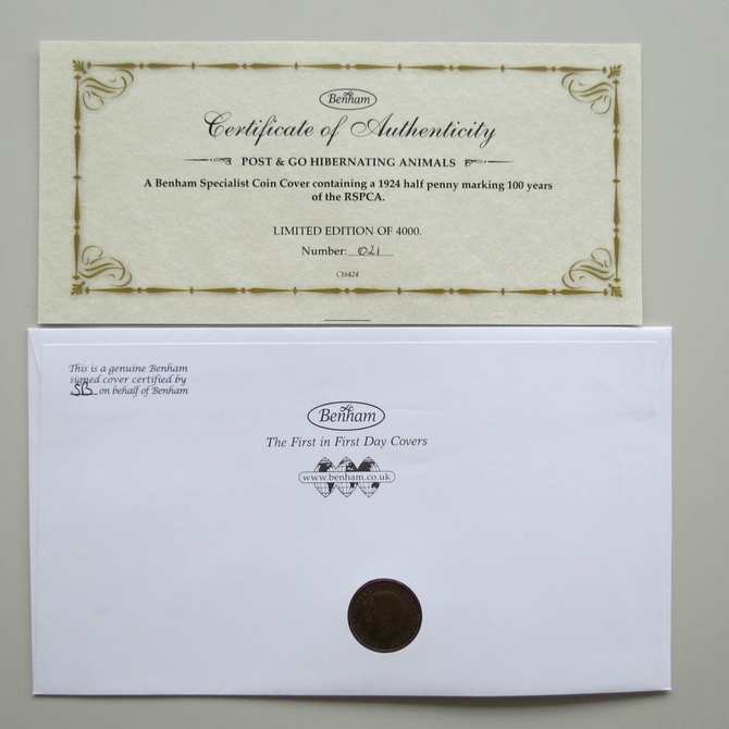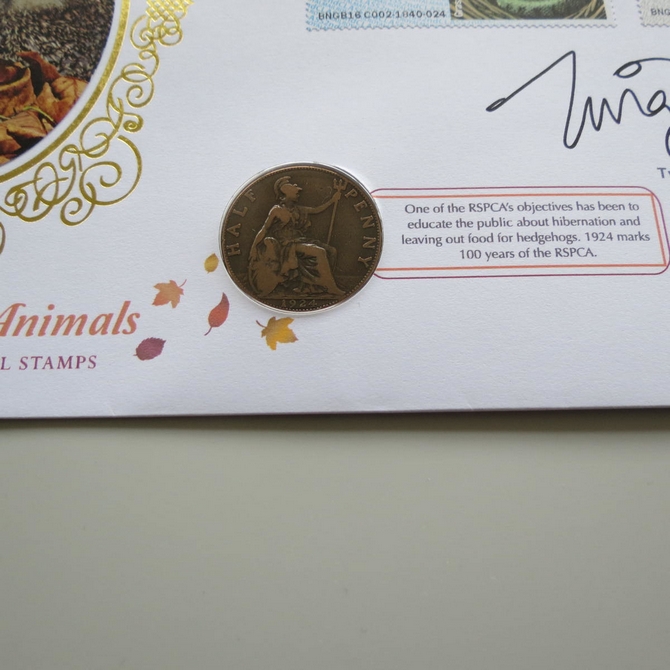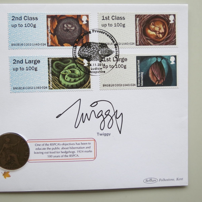 This 2014 hibernating animals Half Penny coin cover is issued by Benham as UK PNC First Day Covers. FDC hand signed by Twiggy. It hosts a 1924 half penny and Royal Mail stamps. Postmark cancelled dated 14th November 2014.