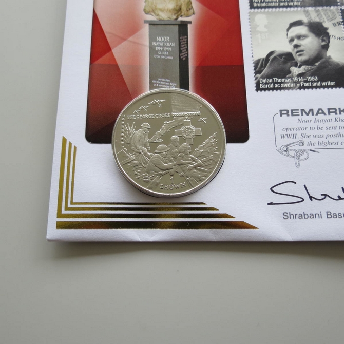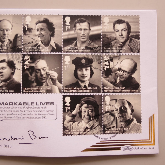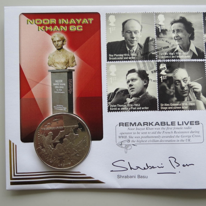 This 2014 Remarkable Lives 1 Crown coin cover is issued by Benham as UK PNC First Day Covers. FDC hand signed by Shrabani Basu. It hosts a brilliant uncirculated one crown coin by the Isle of Man and Royal Mail stamps. Postmark cancelled dated 13th September 2014.