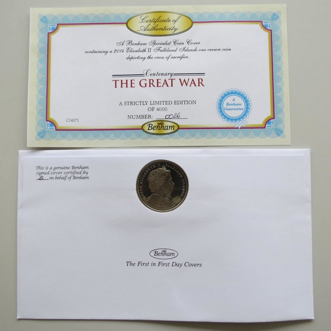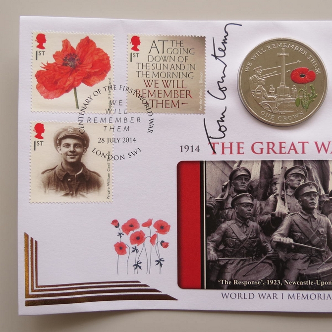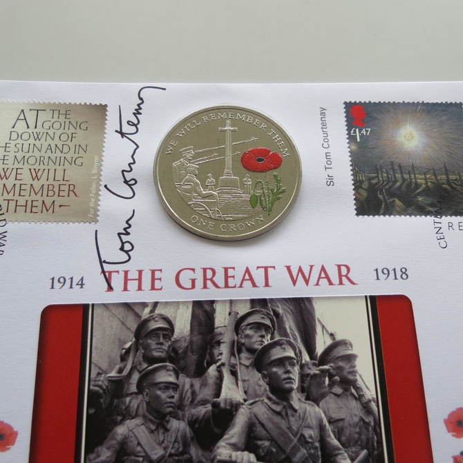 This 2014 The Great War 1 Crown coin cover is issued by Benham as UK PNC First Day Covers. FDC hand signed by Sir Tom Courtenay. It hosts a brilliant uncirculated one crown coin by the Falkland Islands and Royal Mail stamps. Postmark cancelled dated 28th July 2014.