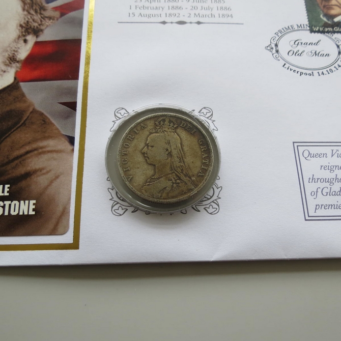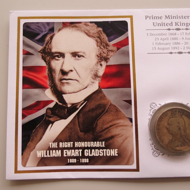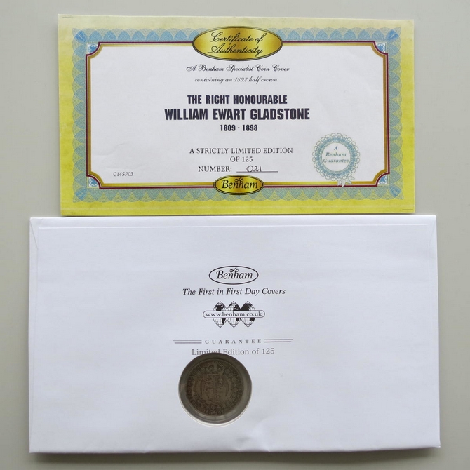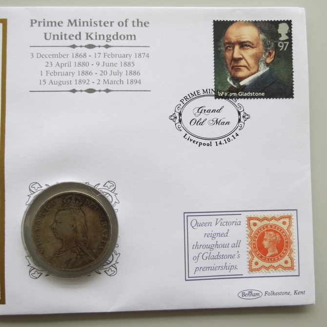 This 2014 William Gladstone Half Crown coin cover is issued by Benham as UK PNC First Day Covers. It hosts a 1892 half crown coin and a Royal Mail stamp showing The Right Honourable William Ewart Gladstone. Cancelled postmark Prime Ministers Grand Old Man Liverpool 14th October 2014.