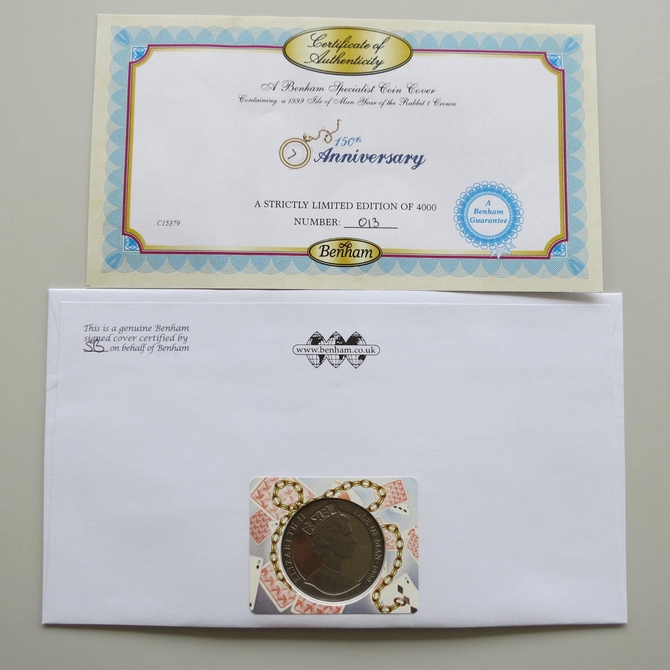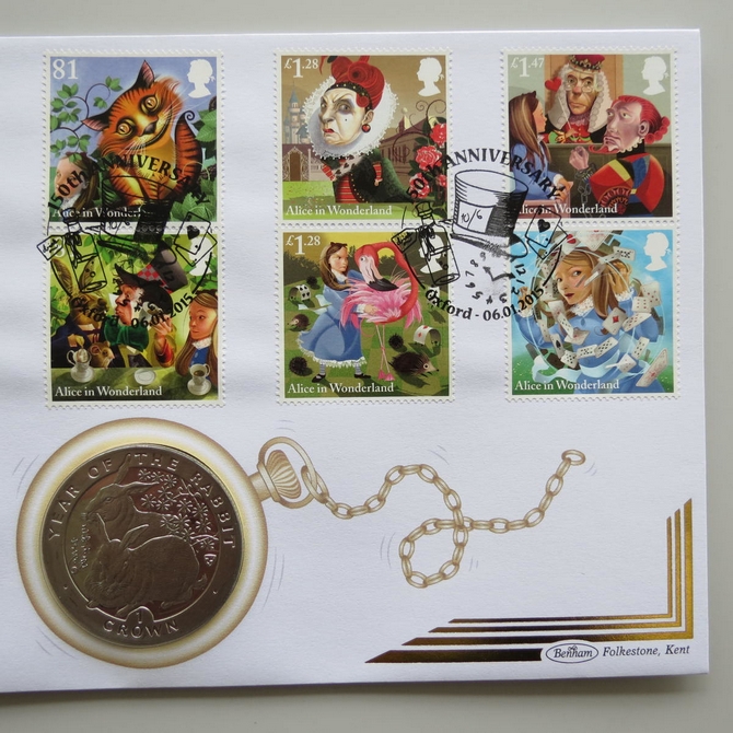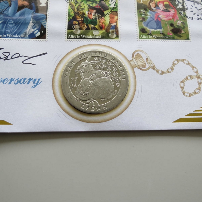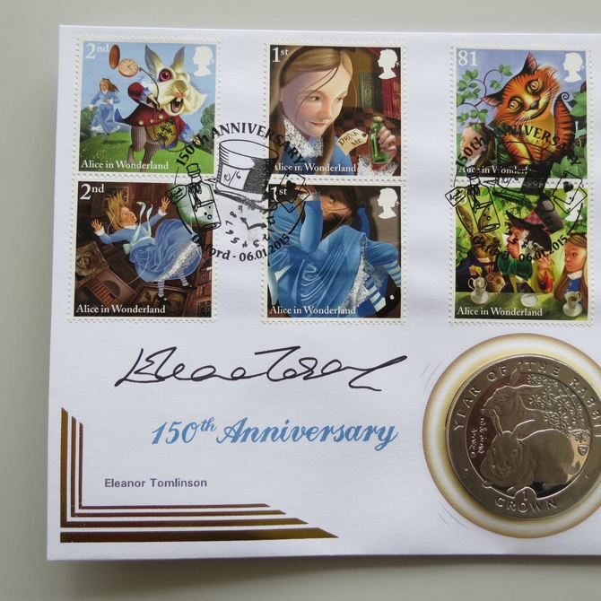 This 2015 Alice In Wonderland 150th anniversary 1 Crown coin cover is issued by Benham as UK PNC First Day Covers. FDC hand signed by Eleanor Tomlinson. It hosts a brilliant uncirculated one crown coin by the Isle of Man and Royal Mail stamps. Postmark cancelled dated 6th January 2015.