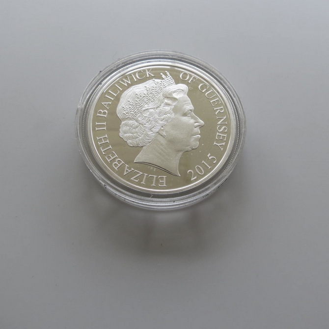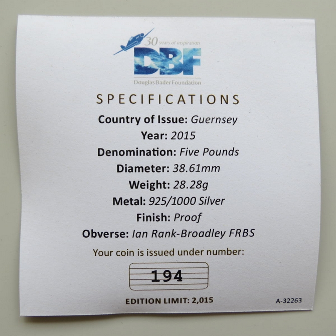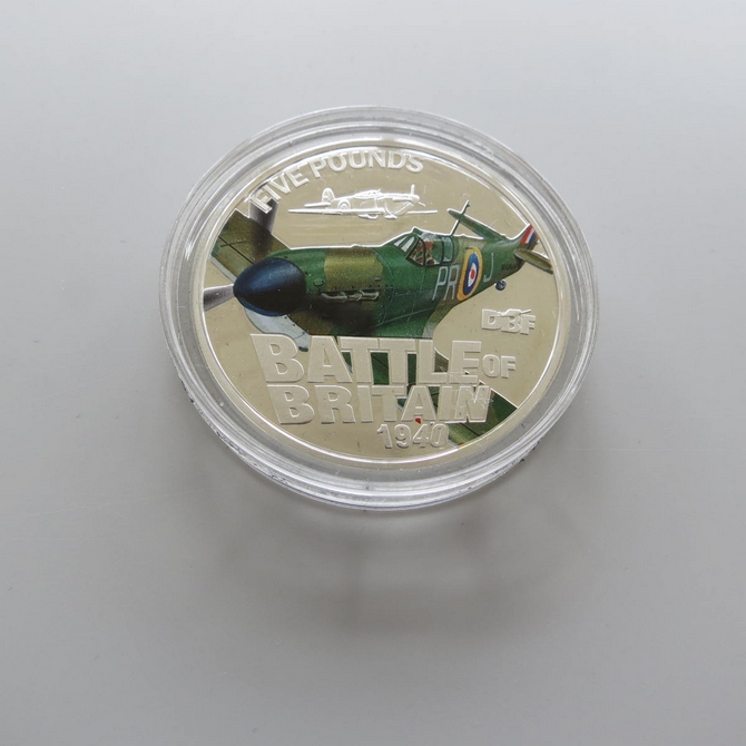 The 2015 Battle of Britain 75th anniversary silver proof 5 pounds coin was issued by Guernsey. It commemorates the 75 years of the battle and illustrates a coloured Supermarine Spitfire aircraft on the .925 silver coin. It is presented in a wooden display case complete with a certificate of authenticity. It enjoys a limited issue of 2,015.