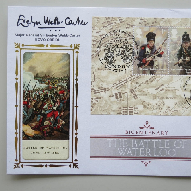 This 2015 Battle of Waterloo bicentenary half penny coin cover is issued by Benham as UK PNC First Day Covers. FDC hand signed by Sir Evelyn Webb-Carter. It hosts a 1965 half penny coin and Royal Mail stamps. Postmark cancelled dated 18th June 2015.