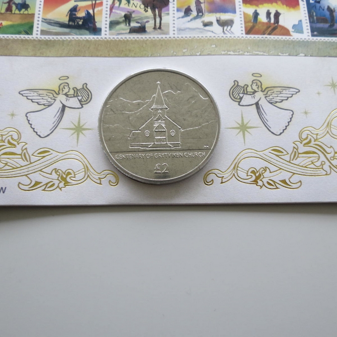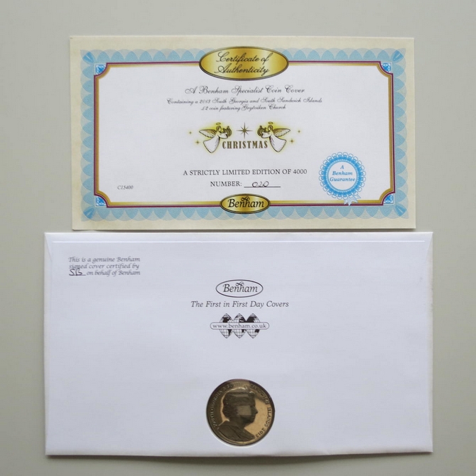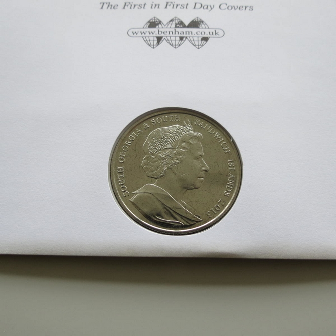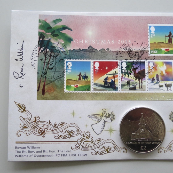 This 2015 Christmas 2 pounds coin cover is issued by Benham as UK PNC First Day Covers. FDC hand signed by Rowan Williams. It hosts a brilliant uncirculated two pounds coin by South Georgia & South Sandwich Islands and Royal Mail stamps. Postmark cancelled dated 3rd November 2015.