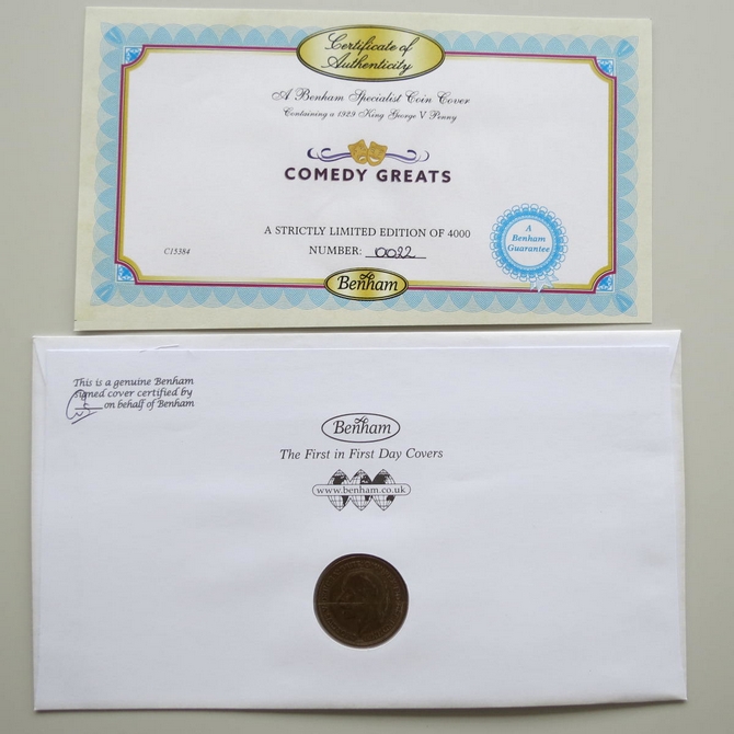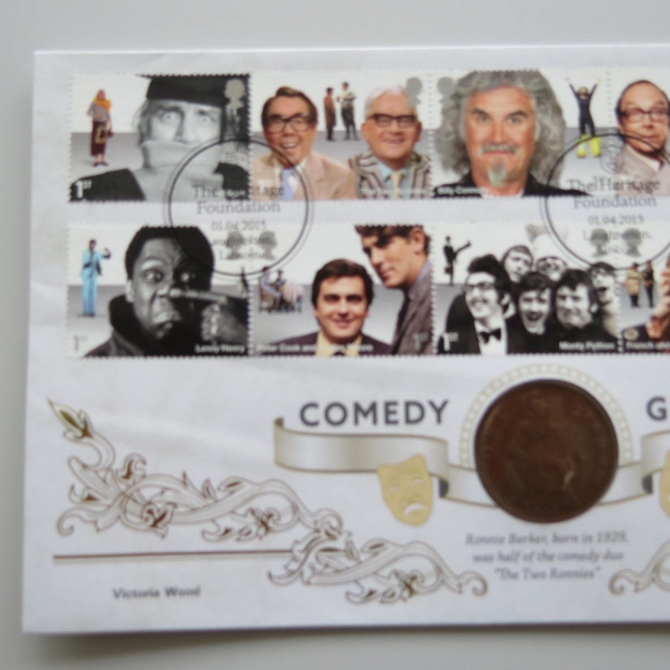 This 2015 Comedy Greats 1 Penny coin cover is issued by Benham as UK PNC First Day Covers. FDC hand siged by Victoria Wood. It hosts a 1929 one penny coin and Royal Mail stamps. Postmark cancelled dated 1st April 2015.
