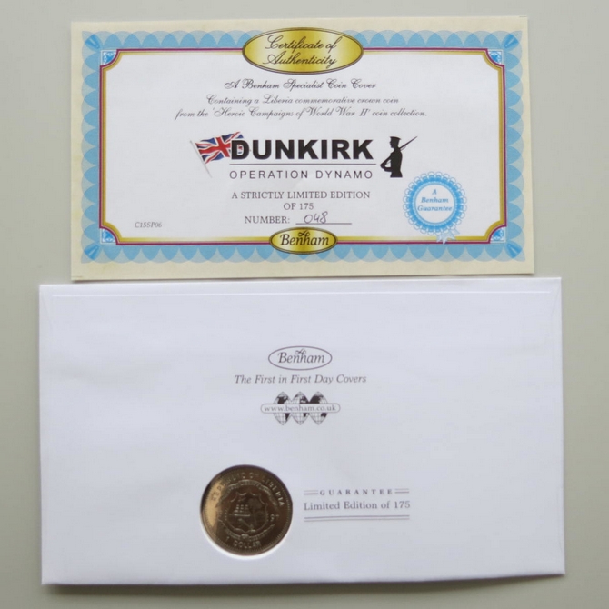 This 2015 Dunkirk Operation Dynamo 1 Dollar coin cover is issued by Benham as UK PNC First Day Covers. It hosts a brilliant uncirculated one dollar coin by Liberia and Royal Mail stamps. Postmark cancelled dated 27th May 2015.