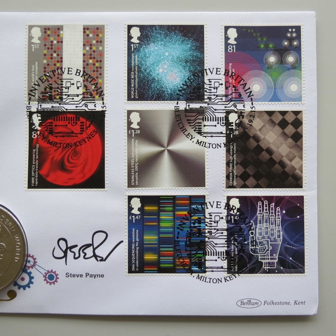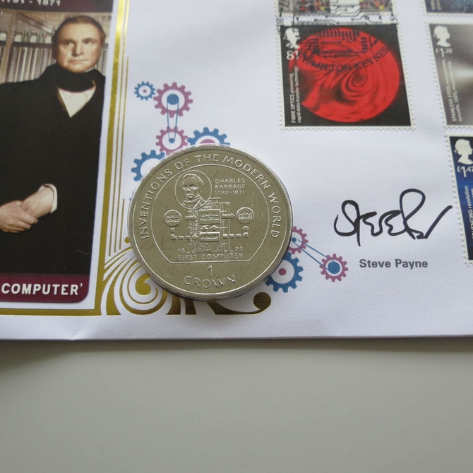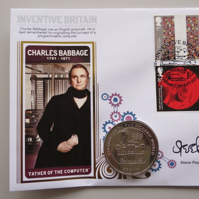 This 2015 Inventive Britain Charles Babbage 1 Crown coin cover is issued by Benham as UK PNC First Day Covers. FDC hand signed by Steve Payne. It hosts a brilliant uncirculated one crown coin by the Isle of Man and Royal Mail stamps. Postmark cancelled dated 19th February 2015.