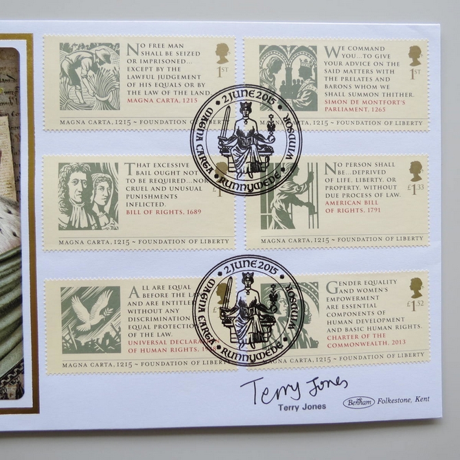 This 2015 Magna Carta 800th anniversary Half Penny coin cover is issued by Benham as UK PNC First Day Covers. FDC hand signed by Terry Jones. It hosts a 1957 half penny coin and Royal Mail stamps. Postmark cancelled dated 2nd june 2015.