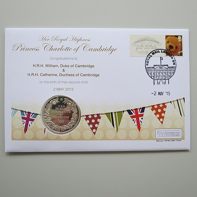 This 2015 Princess Charlotte of Cambridge 1oz silver coin cover is issued by Westminster Collection as UK First Day Covers. It marks the birth of Princess Charlotte of Cambridge and hosts a 1oz silver coin and a Royal Mail stamp. Cancelled postmark Royal Mail London SW 2nd May 2015.