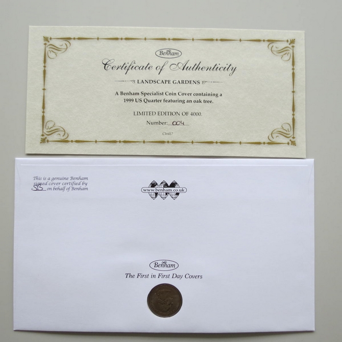 This 2016 Capability Brown 300th anniversary US Quarter coin cover is issued by Benham as UK PNC First Day Covers. FDC hand signed by Andy Sturgeon. It hosts a 1999 US quarter featuring an oak tree and Royal Mail stamps. Postmark cancelled dated 16th August 2016.