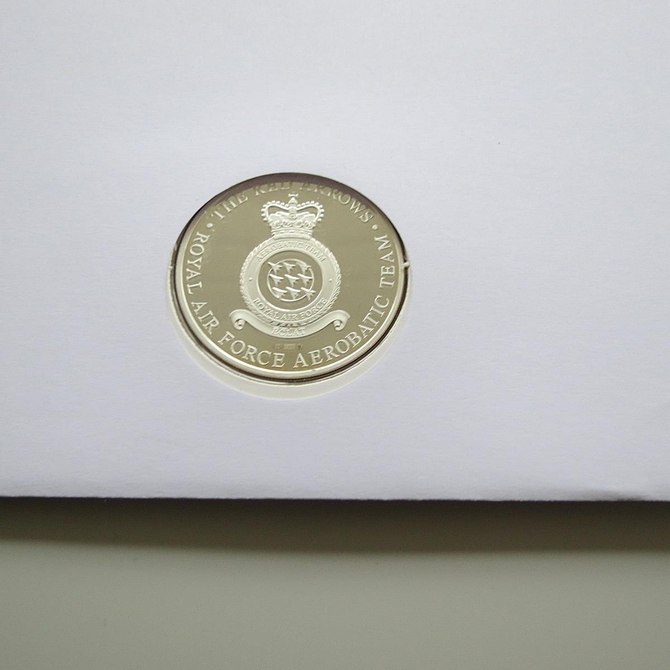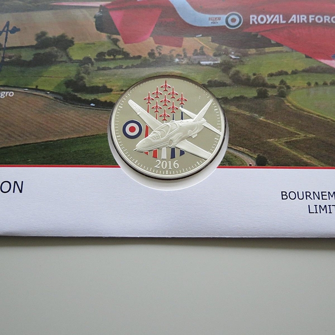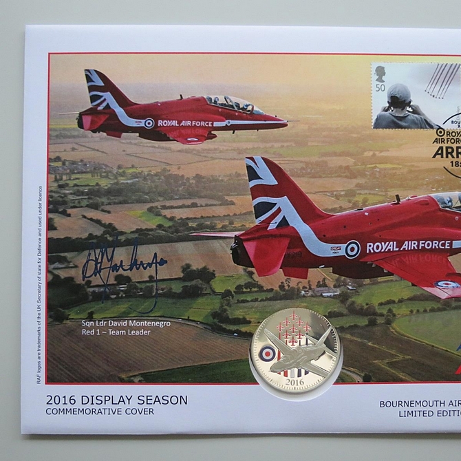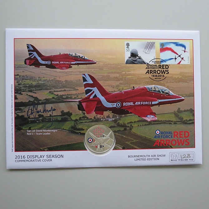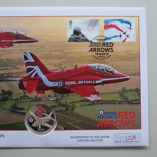 This 2016 RAF Red Arrows 2016 Display Season 1oz silver coin cover is issued by Westminster Collection as UK First Day Covers. It features the Red Arrows display season of 2016 and hosts a 1oz fine silver coin and Royal Mail stamps. Cancelled postmark Royal Air Force Red Arrows Bournemouth Air Show 18th August 2016.