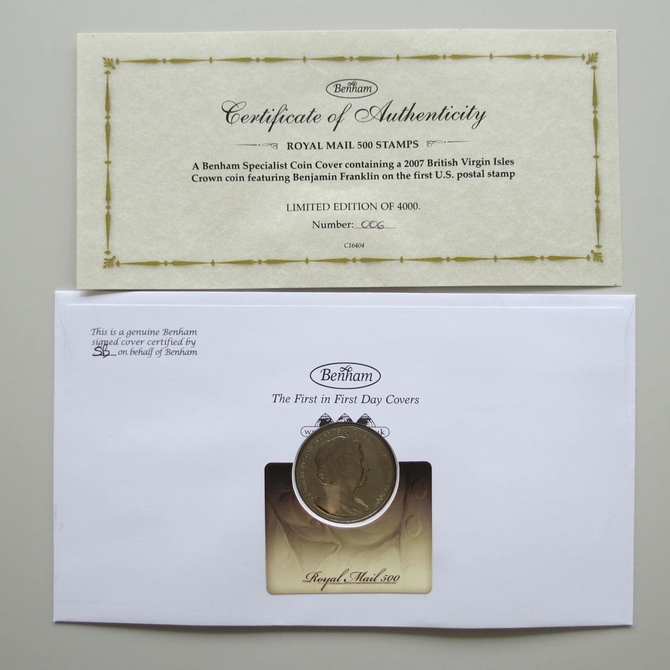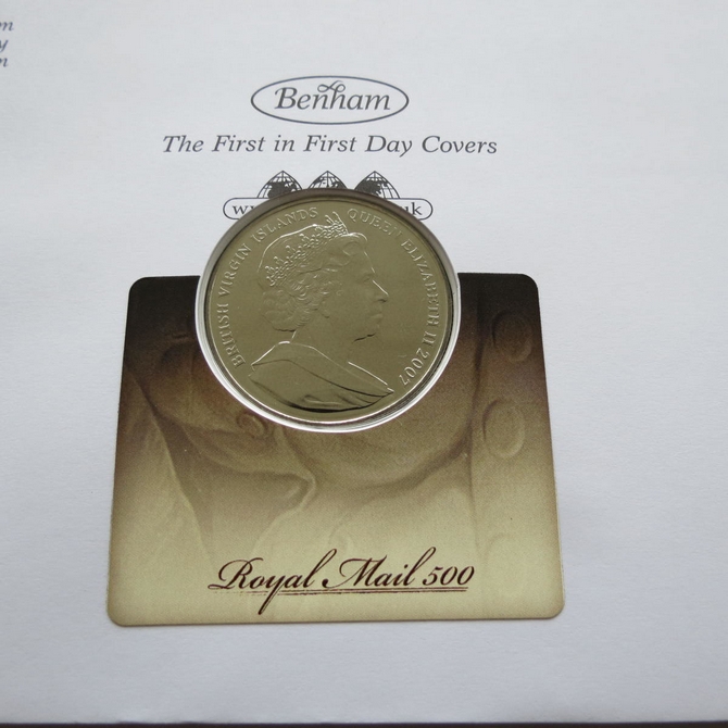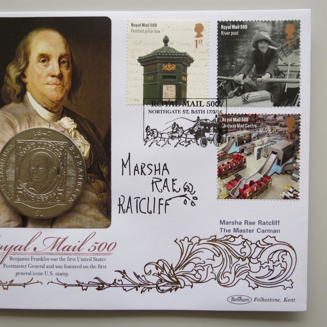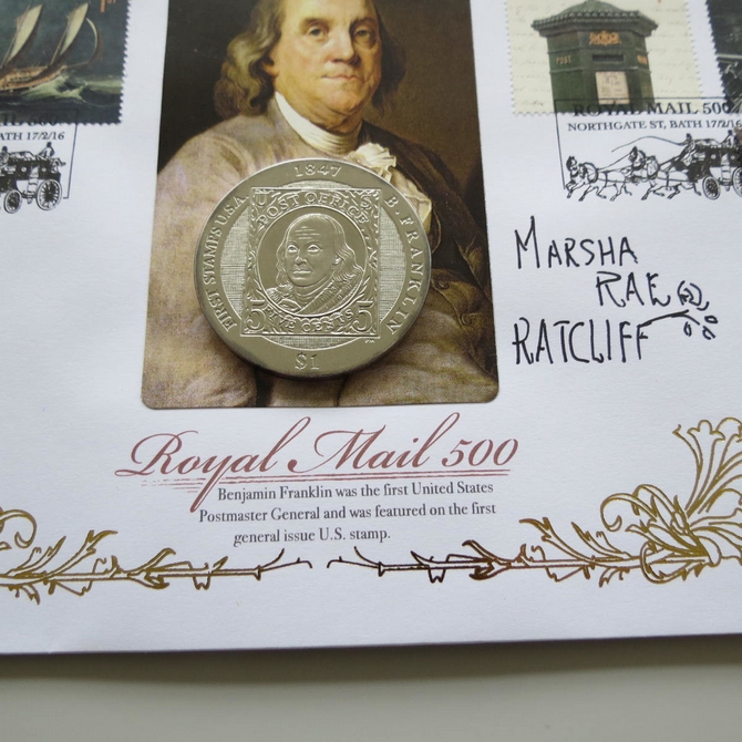 This 2016 Royal Mail 500th anniversary 1 Dollar coin cover is issued by Benham as UK PNC First Day Covers. FDC hand signed by Marsha Rae Ratcliff. It hosts a brilliant uncirculated one dollar coin by the British Virgin Islands and Royal Mail stamps. Postmark cancelled dated 17th February 2016.