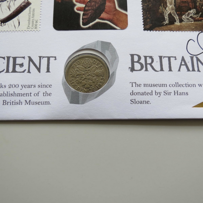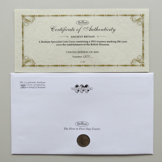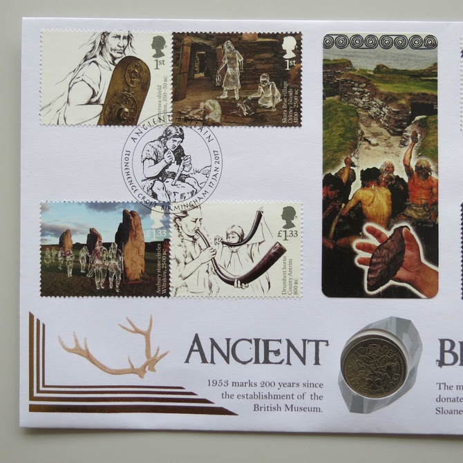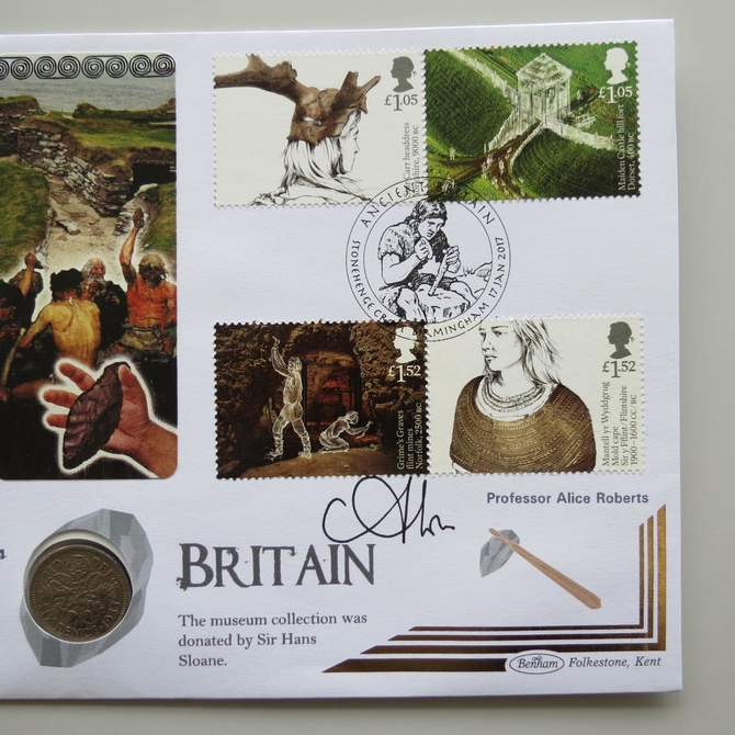 This 2017 Ancient Britain sixpence coin cover is issued by Benham as UK PNC First Day Covers. FDC hand signed by Alice Roberts. It hosts a 1953 Elizabeth II sixpence and Royal Mail stamps. Postmark cancelled dated 17th January 2017.