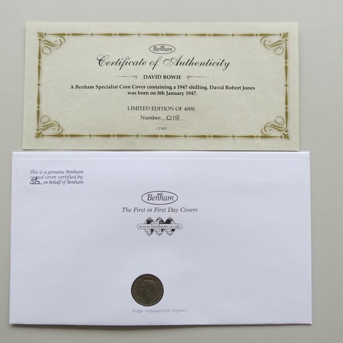 This 2017 David Bowie 1 Shilling coin cover is issued by Benham as UK PNC First Day Covers. FDC hand signed by Rick Wakeman. It hosts a 1947 George VI one shilling and Royal Mail stamps. Postmark cancelled dated 14th March 2017.