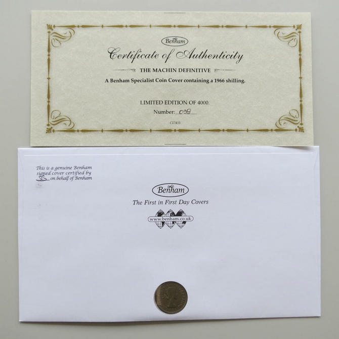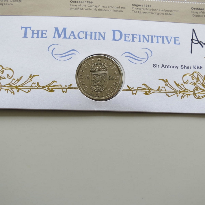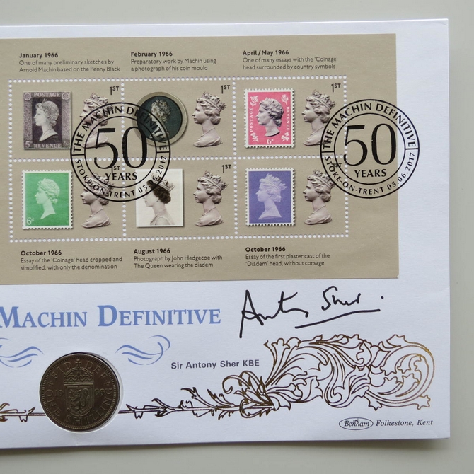 This 2017 Machin Definitive 50 years 1 Shilling coin cover is issued by Benham as UK PNC First Day Covers. FDC hand signed by Sir Anthony Sher. It hosts a 1966 Elizabeth II one shilling coin and Royal Mail stamps. Postmark cancelled dated 5th June 2017.