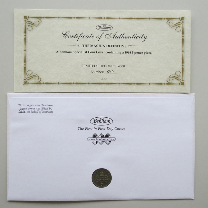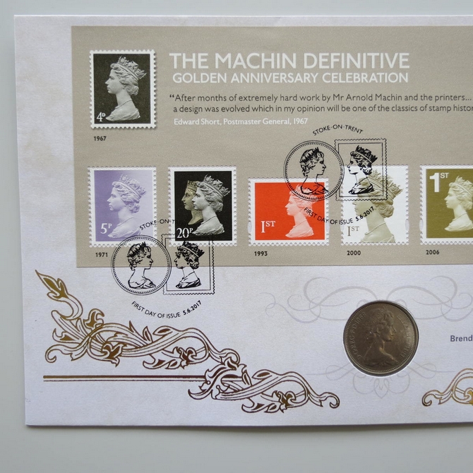 This 2017 Machin Definitive Golden anniversary 5p pence coin cover is issued by Benham as UK PNC First Day Covers. FDC hand signed by Brenda Blethyn. It hosts a 1968 Elizabeth II five pence coin and Royal Mail stamps. Postmark cancelled dated 5th June 2017.