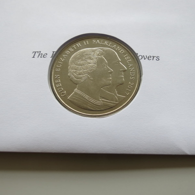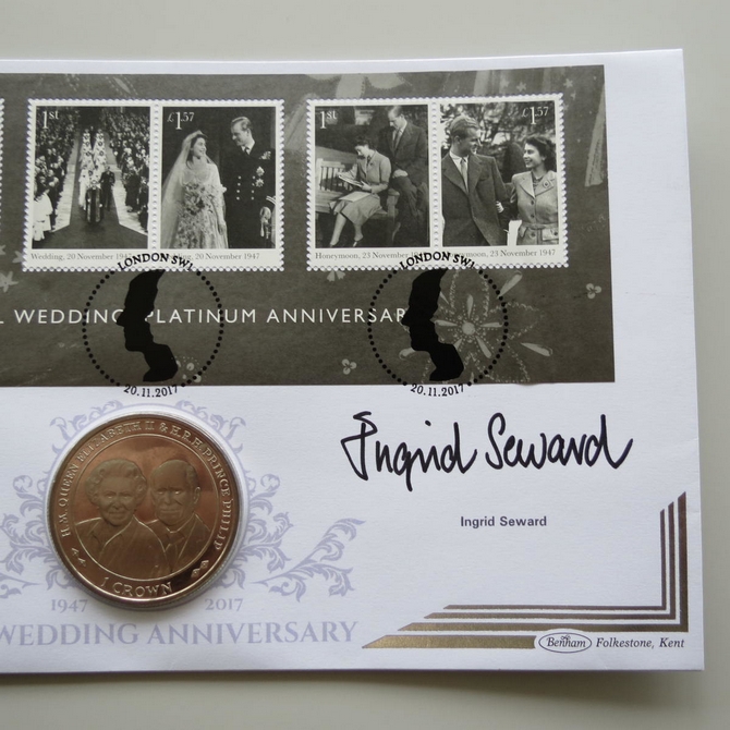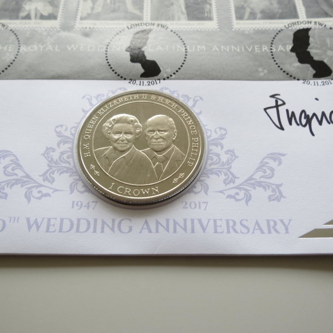 This 2017 Royal Wedding Platinum anniversary 1 Crown coin cover is issued by Benham as UK PNC First Day Covers. FDC hand signed by Ingrid Seward. It hosts a brilliant uncirculated one crown coin by the Falkland Islands and Royal Mail stamps. Postmark cancelled dated 20th November 2017.