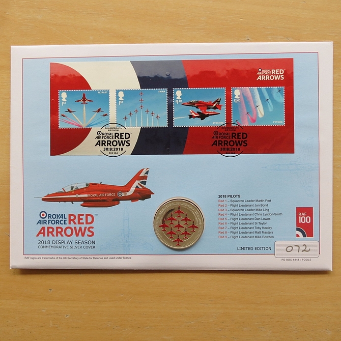 This 2018 Royal Air Force Red Arrows 1oz silver medal cover is a first day cover by Westminster. It celebrates the Red Arrows 2018 display season and hosts a one ounce silver medal depicting the Red Arrows in formation and Royal Mail stamps. Cancelled postmark Bournemouth Air Show Royal Air Force Red Arrows 30th August 2018.