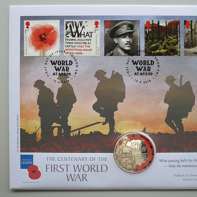 This 2018 The First World War centenary silver proof 5 pounds coin cover is a Westminster first day cover. It marks the centenary of the end of The Great War WWI and hosts a Isle of Man silver proof 5 pounds coin and Royal Mail stamps. Cancelled postmark World War At An End First Day of Issue London SW1 13th September 2018.