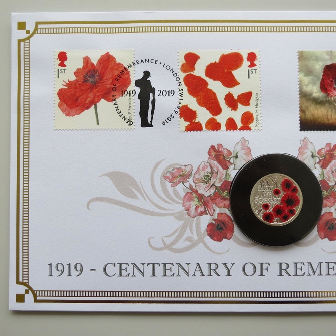 First Day Covers. It marks 100 years of Armistice & Remembrance Day and hosts a silver proof one pound coin and Royal Mail stamps. Cancelled postmark Centenary of Remembrance London SW1 9th September 2019.