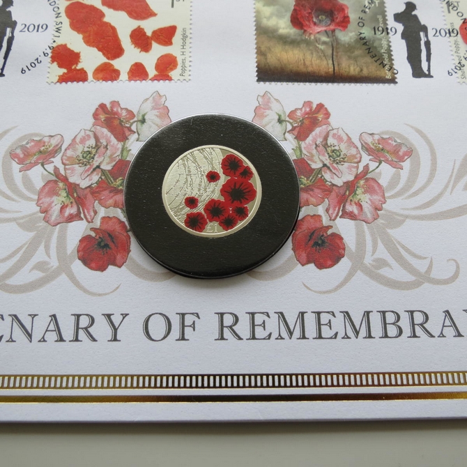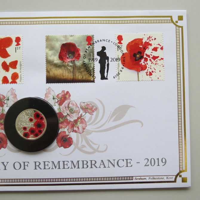 This 2019 Centenary of Remembrance silver proof 1 pound coin cover is issued by Benham as UK PNC