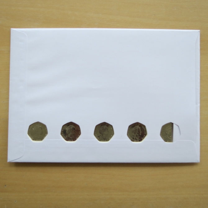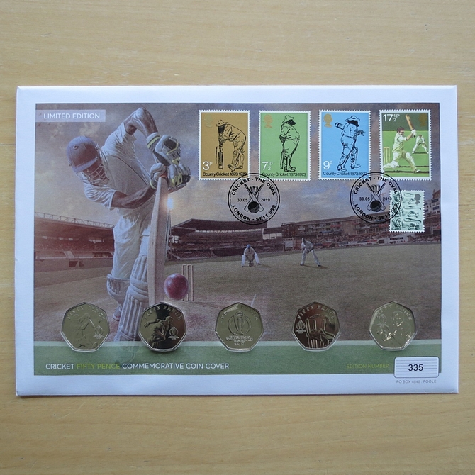 This 2019 Cricket World Cup 50p pence x5 coin cover is a first day cover by Westminster. It features the official ICC Cricket World Cup 2019 five brilliant uncirculated fifty pence coins by the Royal Mint and Royal Mail stamps. The coins depict cricket actions of bowling, batting, catching and wicket bail & stumps together with a IOC 2019 Cricket World Cup England & Wales 50p coin. Cancelled postmark Cricket The Oval London SE11 5SS 30th May 2019.