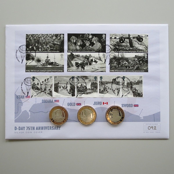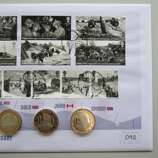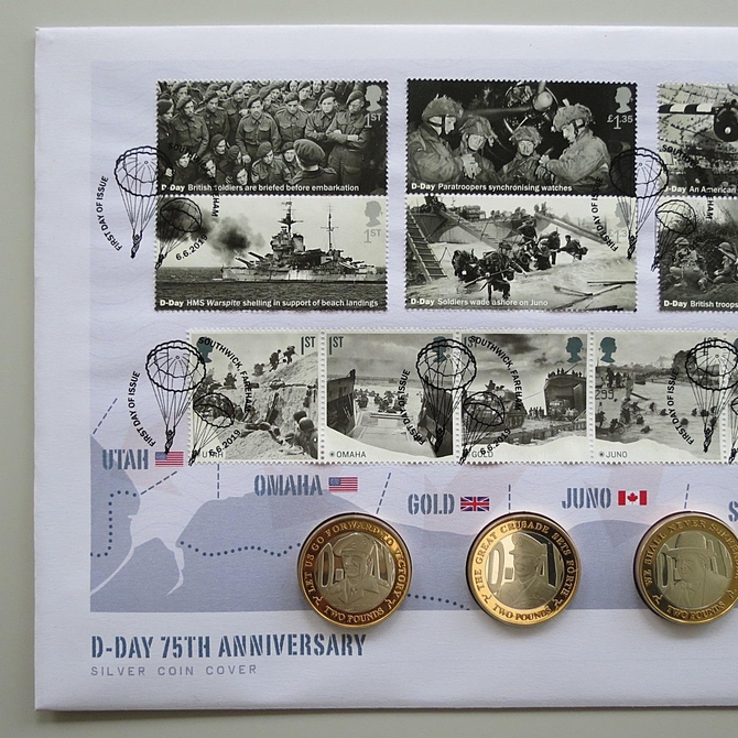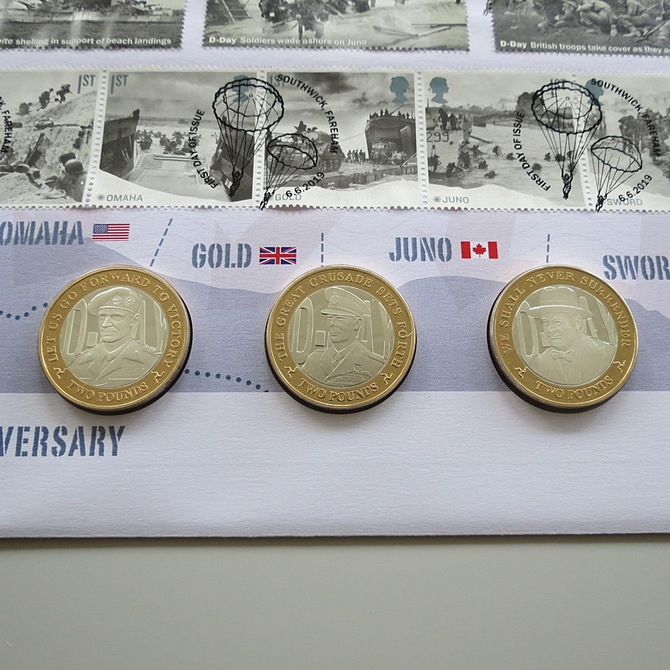 This 2019 D-Day 75th anniversary silver 2 pounds x3 coin cover is a Westminster first day cover. It commemorates the 75 years of D-day in Normandy and hosts three Isle of Man silver proof coins and Royal Mail stamps. The coins feature Sir Winston Churchill, Montgomery and King George VI. Cancelled postmark First DAy of Issue Southwick Fareham 6th June 2019.