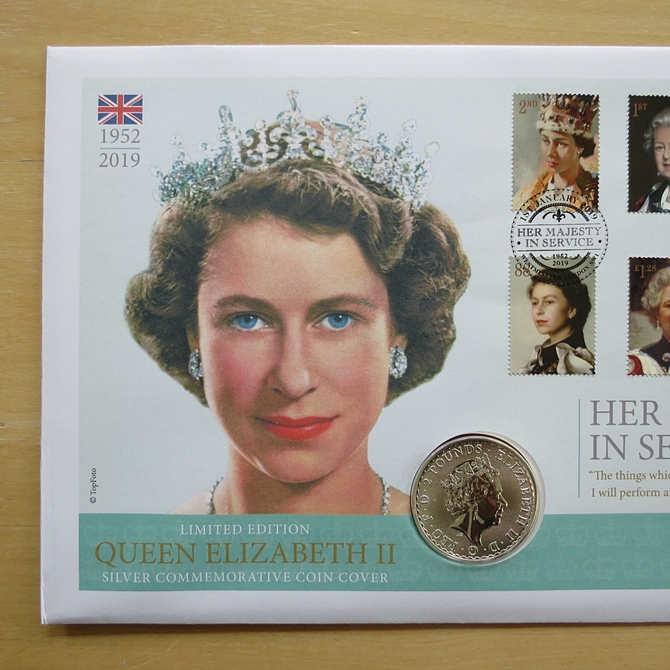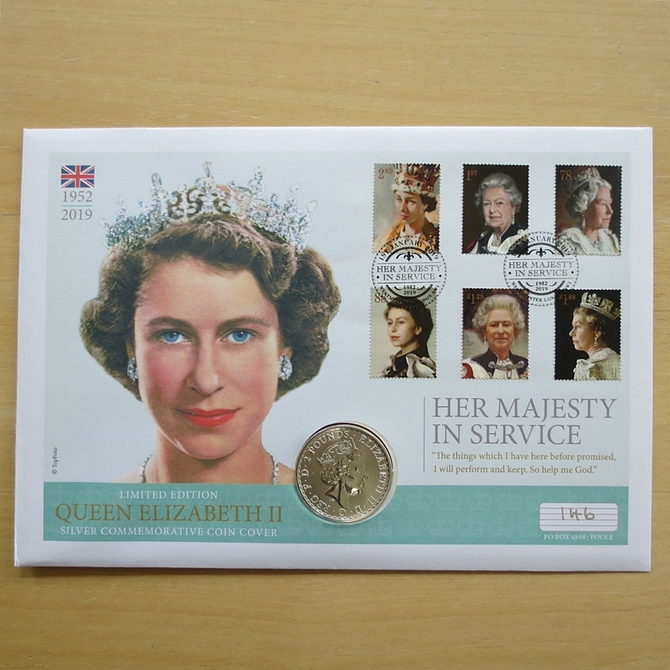 This 2019 Her Majesty In Service 1oz silver Britannia 2 pounds coin cover is a first day cover by Westminster. It celebrates Her Majesty's service to her nation and hosts a 1oz fine silver Britannia two pound coin by the Royal Mint and Royal Mail stamps showing portraits of HM Queen Elizabeth II. The 2019 Britannia coin is struck in Fine999/1000 silver. Cancelled postmark Her Majesty in Service 1952-2019 Westminster London SW1 1st January 2019.