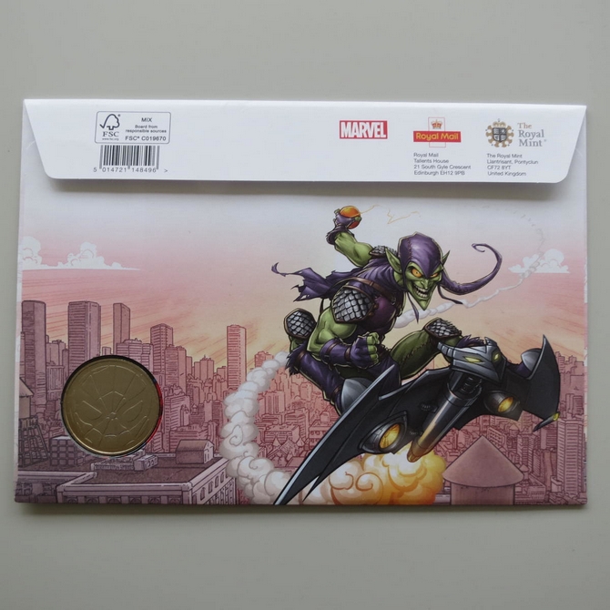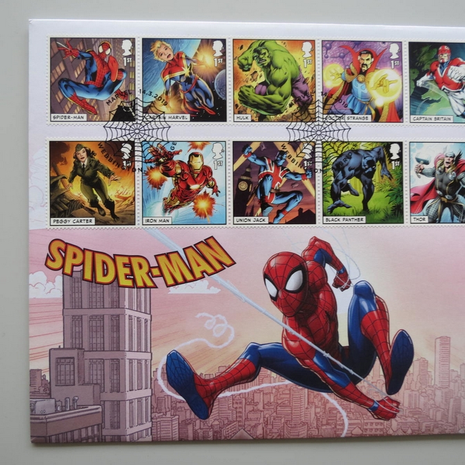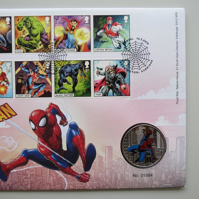 This 2019 Marvel Spider-Man medal cover is issued by Royal Mail as UK PNC First Day Covers. Features Peter Parker as the amazing Spiderman depicted on the medal. The cover also hosts ten Royal Mail stamps each showing Marvel super hero characters. Cancelled postmark Marvel Webbington, Axbridge 14th March 2019.